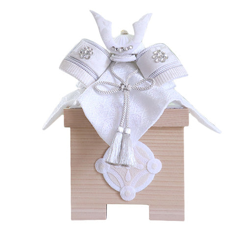 邪気を払う魔除けの意味を持つ神聖な白に、煌めきをイメージするシルバーをプラスしたおしゃれな兜飾りです。