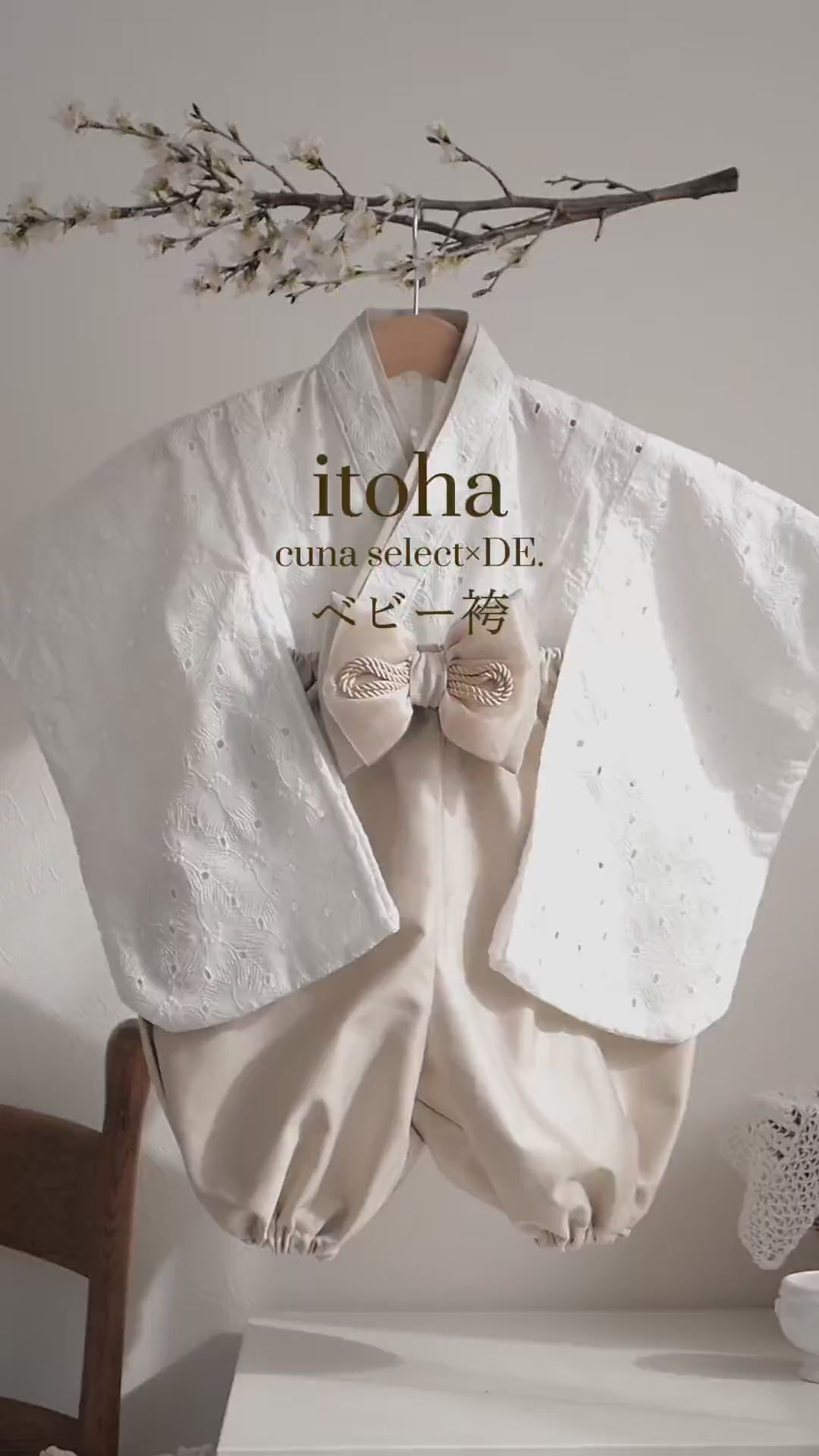 「itoha」は、命を表す「糸(ito)」が、葉(ha)のようにすこやかに育っていく想いを込めた名前です。赤ちゃんの成長の節目を、やさしい余韻の残る一着で。